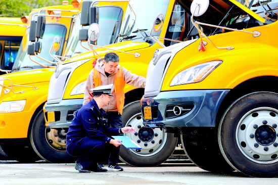 春季开学在即,江西省赣州市公安局交管支队章贡大队组织民警开展校车“体检”专项行动,通过查车况、核设施、讲规范,全方位排查隐患。图为2月25日,民警走进赣州厚德外国语学校对校车进行安全检查。
