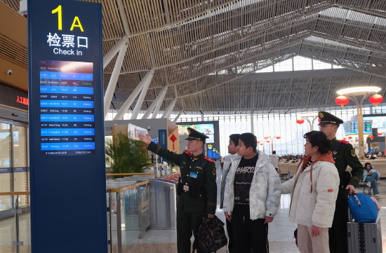 引导旅客是春运期间执勤武警在北京朝阳站的日常,今年春运是廖威望第七次参与车站的执勤任务。