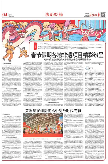 无论是春节本身,还是在春节期间异彩纷呈的其他非遗项目,其真正生命力都在于活态传承,而法治的全方位护航是非遗传承的重要保障,能守护文化根脉,并助力焕发时代生机。法治经纬版本期编发一组稿件,展示各地异彩纷呈的非遗盛宴,聚焦传统节日类非遗的法律保护,敬请关注。