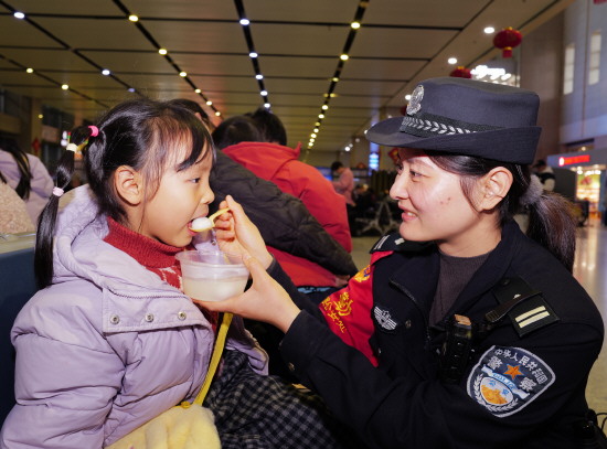 图① 3月2日,宜昌东站迎来春运返程客流高峰。武汉铁路公安局襄阳公安处宜昌东站派出所民警将汤圆送到候车室,与旅客共庆元宵佳节,并开展法治宣传。图为民警给候车的孩子喂食汤圆。