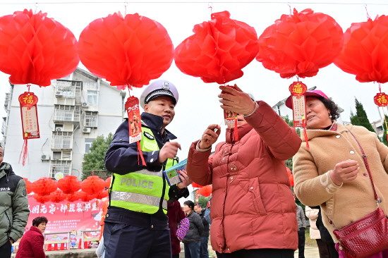 图② 3月3日,江西省武宁县公安局交管大队组织民辅警走进社区,举办“庆元宵、猜灯谜、学交规”活动,以群众喜闻乐见的方式宣传交通安全法律法规。图为元宵节当天辅警在豫宁街道九岭社区党建广场与群众一起猜灯谜、庆元宵。
