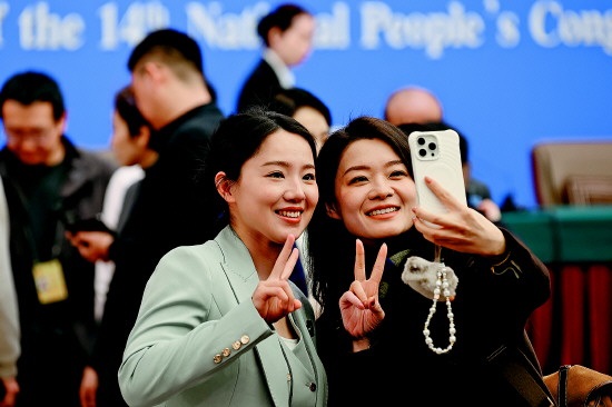 图② 3月7日,十四届全国人大四次会议在北京梅地亚中心新闻发布厅举行民生主题记者会,记者在会后合影留念。