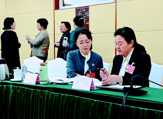 图① 3月6日,全国政协十四届四次会议举行小组会议,全国政协委员、吉林省司法厅副厅长邓健(右二)会后与其他委员就“十五五”规划纲要草案内容进行交流。 本报记者 范瑞恒 摄