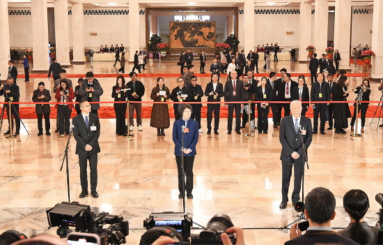 图① 3月7日,全国政协十四届四次会议第二场“委员通道”集体采访活动在北京人民大会堂举行。