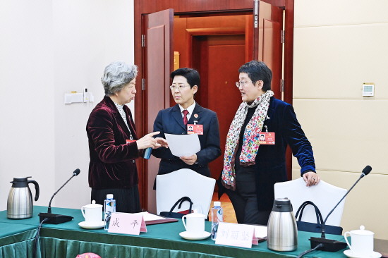 图② 3月6日,全国政协十四届四次会议举行小组会议,全国政协委员、陕西省人民检察院副检察长高洁(中)会后与其他委员交流。