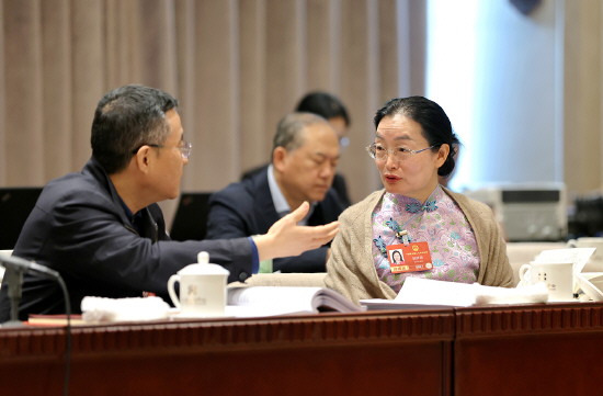 3月8日,十四届全国人大四次会议北京代表团举行小组会议,审议生态环境法典草案。图为代表们在会议间隙交流。 本报记者 徐伟伦 摄