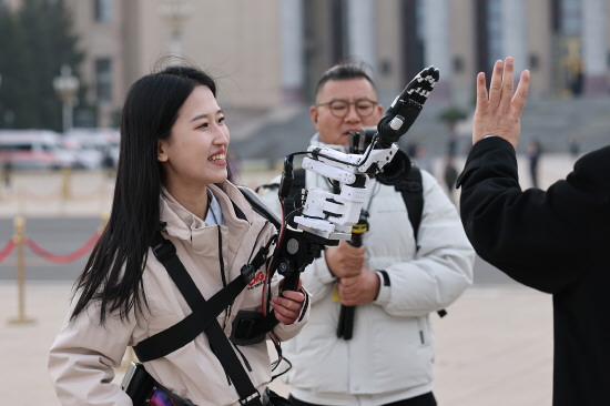 图② 3月7日,全国政协十四届四次会议在人民大会堂举行第二次全体会议,记者在会前用机械手和委员互动。