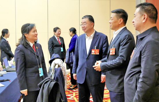 图① 3月10日,十四届全国人大四次会议山东省代表团举行小组会议,审议“两高”工作报告。图为代表在会后和“两高”工作人员交流。