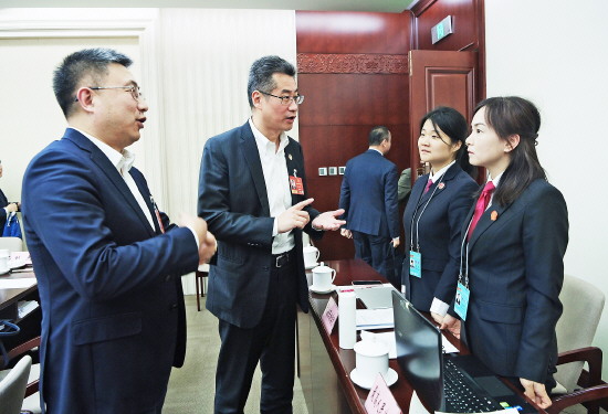 图② 3月9日,全国政协十四届四次会议举行小组会议。天津市律师协会会长牛同栩委员(左一)、上海市新的社会阶层人士联谊会会长张毅委员(左二)会后和“两高”工作人员就“两高”工作报告沟通交流。