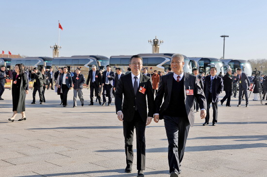 图① 3月11日,全国政协十四届四次会议在北京人民大会堂举行闭幕会,政协委员边交流边步入会场。