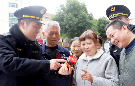 近日,浙江省台州市路桥区路北街道市场监督管理所组织工作人员上街头、下社区、进市场、入企业,广泛宣传消费者维权及辨别商品真假知识。图为3月9日,工作人员向群众讲解如何辨别商品真假。 本报通讯员 蒋友亲 摄