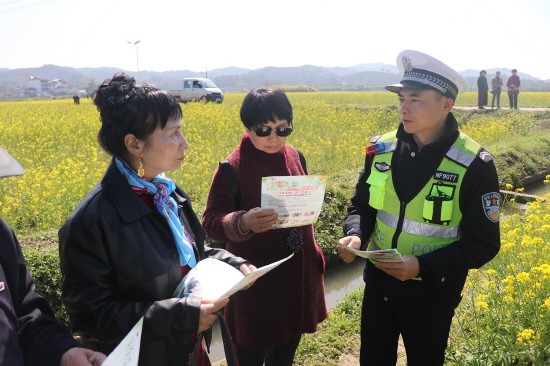 近日,江西省南丰县公安局交管大队组建“踏春”警务巡逻小分队,深入辖区景点开展秩序维护、交通安全法律法规宣传等工作。图为辅警向游客宣讲交通安全知识。