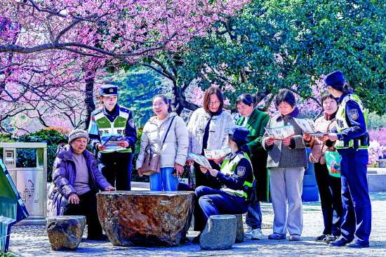 近日,江苏省常州市公安局天宁分局局前街派出所组织民警在辖区开展巡逻,并向市民面对面开展反诈宣传工作。图为民警在红梅公园向游客开展反诈宣传。