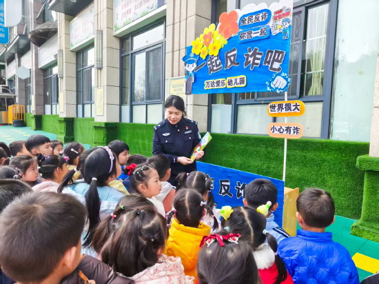 图② 3月16日,湖北省十堰市公安局张湾区分局汉江路派出所社区民警走进辖区幼儿园,用通俗易懂的方式开展反诈宣讲。图为民警为孩子们普及防骗知识。