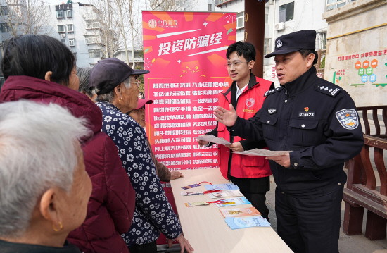 图③ 近日,山东省济南市公安局市中分局杆石桥派出所联合乐山小区社区开展安全知识宣传。图为民警为小区居民宣讲反诈和防范非法集资知识。