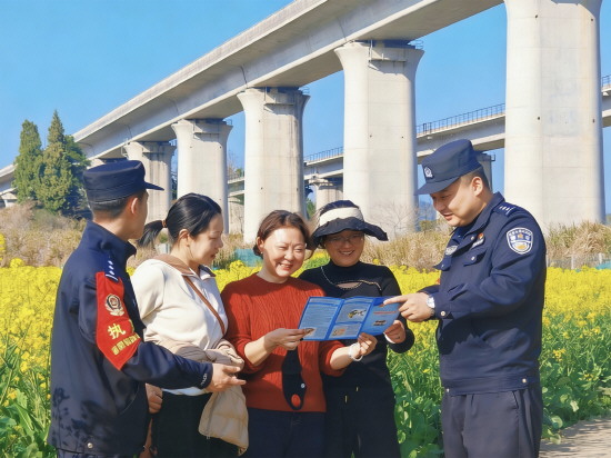 图① 春日的婺源,油菜花盛开。近日,南昌铁路公安局鹰潭公安处婺源站派出所民警走进花海菜田,向游客宣传反诈、防盗、铁路安全等知识。图为民警向游客讲解反诈知识。