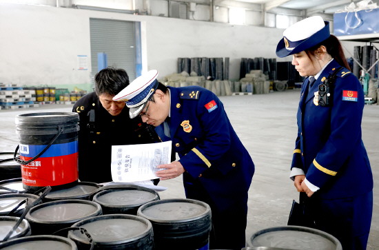 近日,山东省枣庄市台儿庄区消防救援大队联合台儿庄区市场监督管理局组织执法人员深入辖区消防产品生产企业开展消防产品质量监督专项检查。图为执法人员正在对防火涂料质量进行抽检。 本报通讯员 季龙 摄