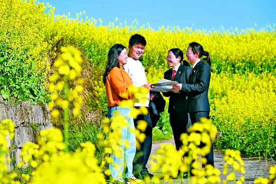 ▲ 近日,重庆市梁平区人民法院袁驿法庭组织干警走进油菜花田等春日踏青打卡地,在提醒游客文明出游的同时开展普法活动。图为法院干警在油菜花田旁向游客普法。