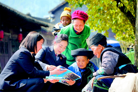 近日,湖南省保靖县人民检察院“苗语专班”的检察官们走进吕洞山镇,用乡音向群众宣讲法律知识,教授群众如何防范法律风险,提升群众法律意识。图为检察干警向群众讲解法律知识。