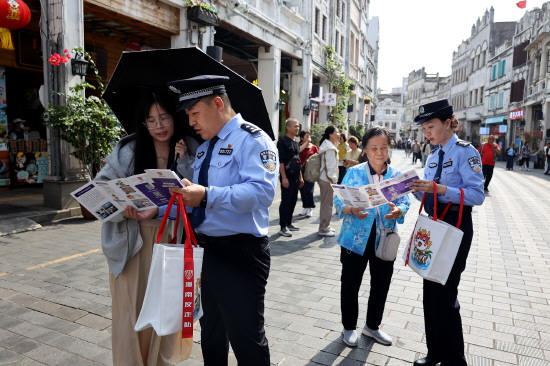图① 海南省公安厅反走私和海岸管理总队民警近日走进海口骑楼老街,为市民游客送上“反走私安全知识大礼包”。图为民警向群众讲解反走私法律知识。