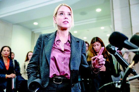 当地时间3月18日,美国司法部长帕姆·邦迪在国会山向众议院监督与政府改革委员会成员通报对爱泼斯坦案的调查情况后,与记者交谈。