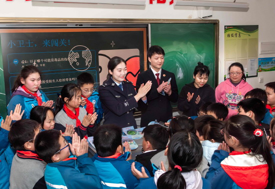 图① 近日,湖北省黄石市下陆区人民检察院联合黄石市公安局下陆区分局走进黄石市广州路小学,开展“珍爱生命,远离毒品”禁毒宣讲活动。图为检察官和民警向学生讲解毒品的种类和危害。