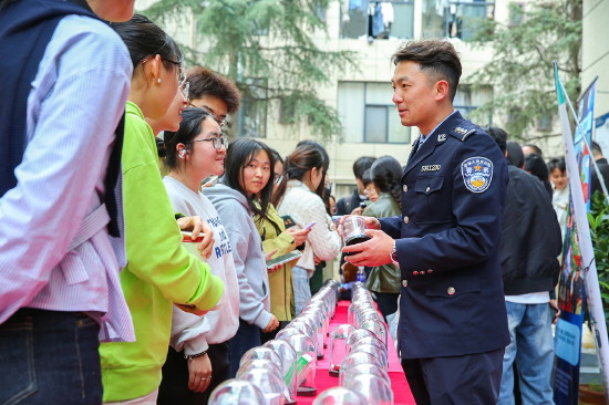 图③ 近日,云南省第一强制隔离戒毒所“如一”宣讲团民警走进昆明医科大学海源学院,向学生宣讲禁毒防毒知识。图为民警向学生讲解防范新型毒品知识。