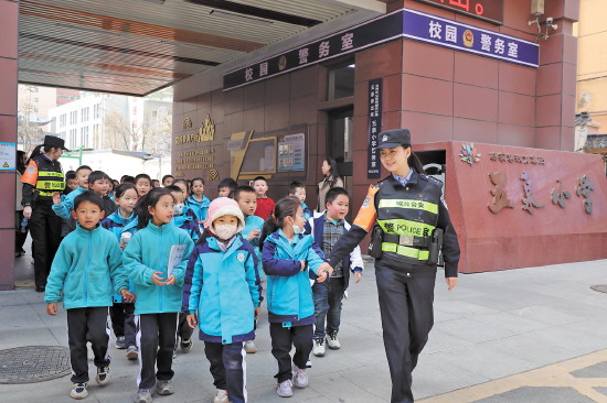 春季开学以来,甘肃省兰州市公安局城关分局五泉派出所立足辖区实际,以五泉小学等学校为重点,常态化开展护学工作。图为3月23日,民警在校园门口定点值守、护送学生过马路。 本报记者 赵志锋 本报通讯员 杨钊 摄