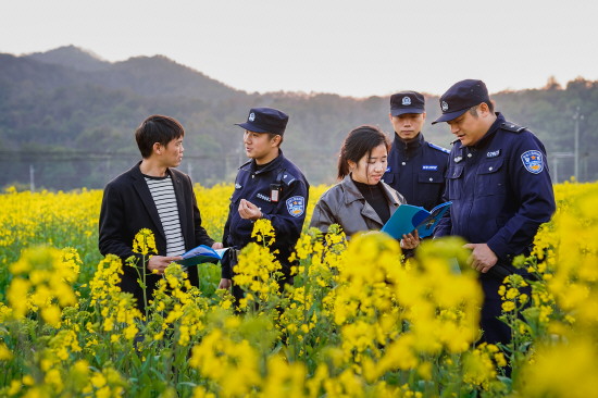 近日,江西省永修县公安局云山派出所民辅警深入辖区各景点开展秩序维护、反诈宣传等工作,向游客普及法律知识。图为民辅警向游客宣传防范电信网络诈骗知识。 本报记者 周孝清 本报通讯员 熊逸晖 摄