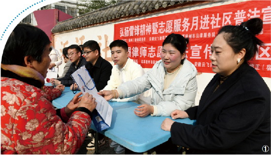 图① 3月8日,安徽省宿州市司法局、埇桥区司法局组织普法小分队,走进社区开展志愿服务,解答居民法律问题。 本报通讯员 阮传宝 摄