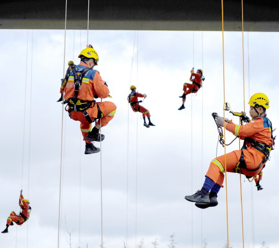 近日,四川消防救援机动总队在位于成都的国家西南区域应急救援中心举行新消防员入职训练结业暨家属开放日活动。图为新消防员进行绳索训练。