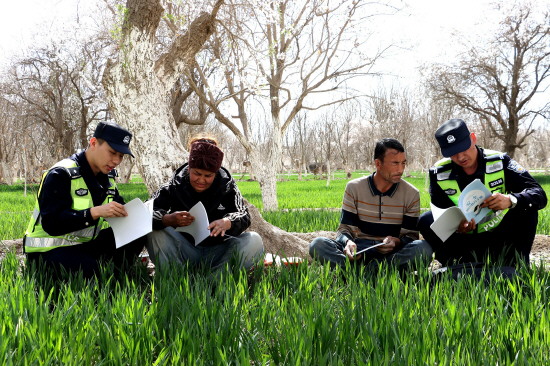 ▲ 近日,乌鲁木齐铁路公安局喀什公安处莎车站派出所启动“农时警务”,民辅警走进田间地头、温室大棚等春耕一线,开展护航春耕普法宣传活动。图为民警向铁路沿线群众讲解春耕安全知识。 本报记者 潘从武 本报通讯员 曹吉利 封晨康 摄