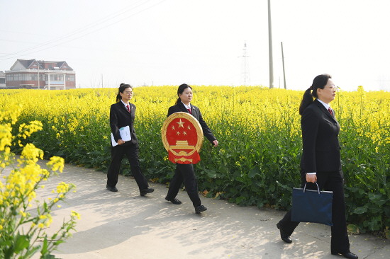 ▲ 正值春耕时节,近日,江苏省金湖县人民法院宝应湖人民法庭干警穿过田间地头,将巡回审判庭搬到村民家门口,开展护农惠农普法宣传,以实际行动护航春耕生产,助力乡村振兴。图为干警们携带国徽前往村民家门口开庭。 本报记者 罗莎莎 本报通讯员 冯国丽 摄