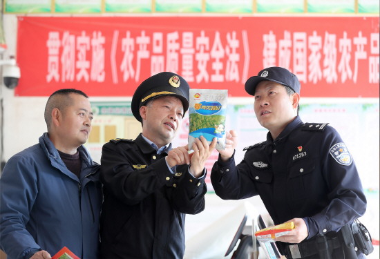 近日,湖北省荆门市沙洋县公安、农业农村、市场监管等部门联动开展春季农资打假专项行动。图为沙洋县公安局民警与市场监管执法人员在该县一家农资经营门店开展检查。