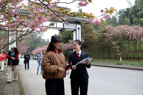 近日,重庆市南川区人民检察院公益诉讼检察官走进大观镇樱花大道,将法治宣传送到赏花游客身边,让法治春风与樱花美景相伴同行。图为检察官在给游客开展普法宣传。
