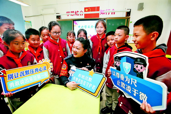 3月30日,山东省济南市公安局市中分局民警走进汇诚小学,开展以“法治护航 阳光成长”为主题的校园安全宣传。图为民警向孩子们宣讲防范校园欺凌相关知识。