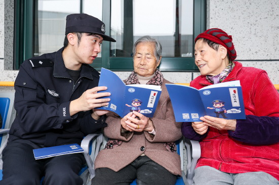 图② 近日,浙江省岱山县公安局岱东派出所民警走进辖区广华医院颐养院,开展防范电信网络诈骗宣传。图为民警向老人讲解反诈知识。