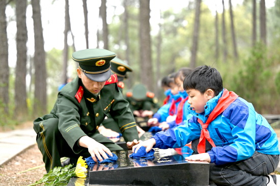 近日,武警安徽总队合肥支队联合合肥市肥东县长临河学校到茶壶山烈士陵园,开展“清明祭英烈 薪火永相传”主题祭扫活动。图为官兵和学生们一起小心翼翼地擦拭烈士墓碑。 本报通讯员 徐伟 摄