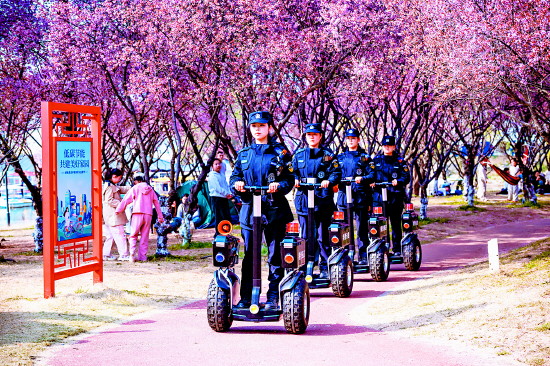 近日,江苏省东海县公安局巡特警大队组织特警对西双湖湿地公园开展高频次巡逻,守护市民的春日之旅。图为女特警队员驾驶警用平衡车开展巡逻。 本报记者 罗莎莎 本报通讯员 袁青青 摄