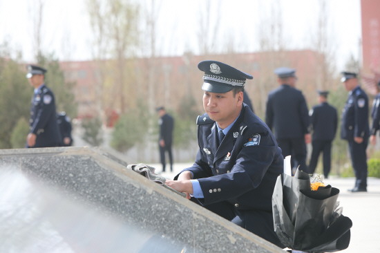 ▲ 4月1日,乌鲁木齐铁路公安局喀什公安处巴楚站派出所党支部开展清明祭扫英烈主题党日活动。图为民辅警擦拭碑体、清扫墓园。 本报记者 潘从武 本报通讯员 邓韬 依斯坎达尔·艾依达尔 摄