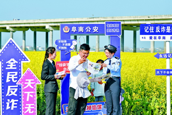 4月1日,安徽省阜南县公安局经侦民警、阜南县人民法院工作人员来到中岗镇千亩油菜花景区,开展防诈反诈普法宣传。图为民警和法院工作人员向游客宣讲远离非法投资相关知识。 本报通讯员 吕乃明 摄