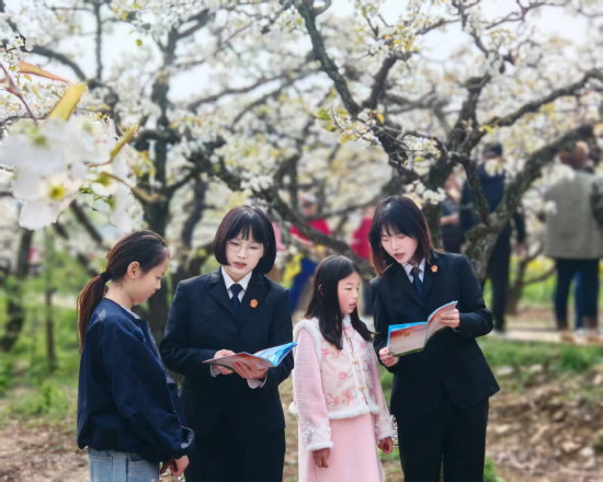 安徽寿县近日举行八公山梨花节·梨花诗会活动。其间,寿县人民法院青年干警穿梭于万亩梨园中,向往来游客开展普法巡讲。图为干警向游客讲解生态环境保护法律知识。 本报记者 范天娇 本报通讯员 严翠 摄