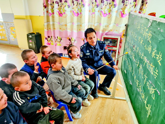 近日,新疆出入境边防检查总站克州边境管理支队黑牙克恰提边境派出所民警走进辖区幼儿园,开展防拐防骗知识宣讲。图为民警教唱防拐防骗儿歌。 本报记者 潘从武 本报通讯员 王汉宾 摄