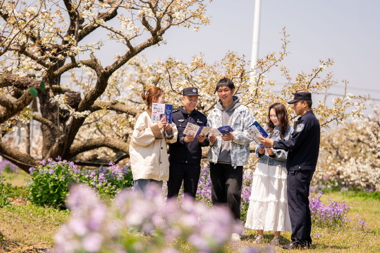 为保障游客赏花安全,连日来,江苏省滨海县公安局农业园派出所将警务工作延伸至梨花语景区,组织民辅警走进花海,向游客普及安全出行出游知识。图为民警向游客发放宣传手册。