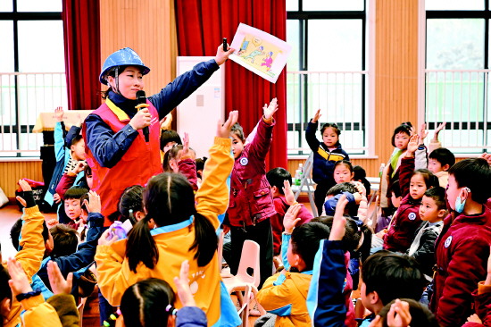 近日,国网宜昌供电公司组织共产党员服务队,走进湖北省宜昌市某小学,开展安全用电宣传活动。图为同学们踊跃举手回答服务队队员提出的问题,在轻松愉悦的氛围中学习安全用电知识。 郝丽芳 摄