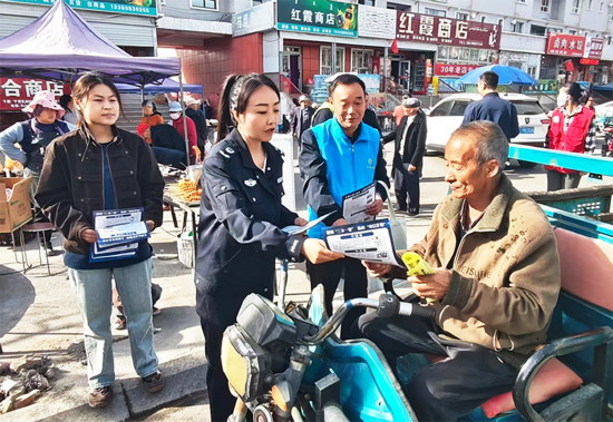 ▲ 4月7日,新疆生产建设兵团第五师八十四团司法所联合博乐垦区公安局交警大队等部门,走进集市开展道路交通安全法宣传活动,守护群众春耕生产和出行安全。图为宣讲队员向群众发放行车安全提示单。 本报记者 潘从武 本报通讯员 侯宝成 热孜阿 摄