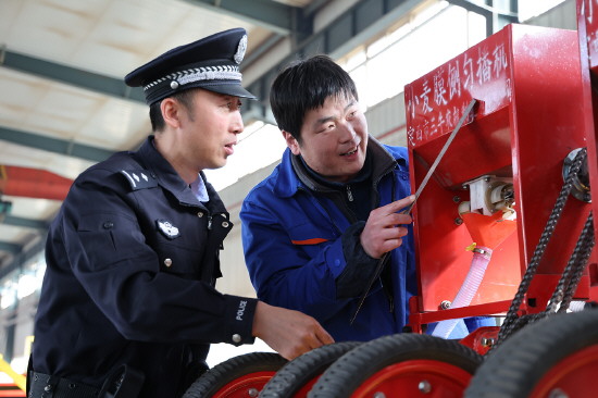 ▲ 近日,甘肃省定西市公安局安定分局民辅警深入辖区农机制造、销售网点,开展农机安全隐患排查工作,助力春耕生产。图为民警对农机进行安全检查。 本报记者 赵志锋 本报通讯员 杨永刚 摄
