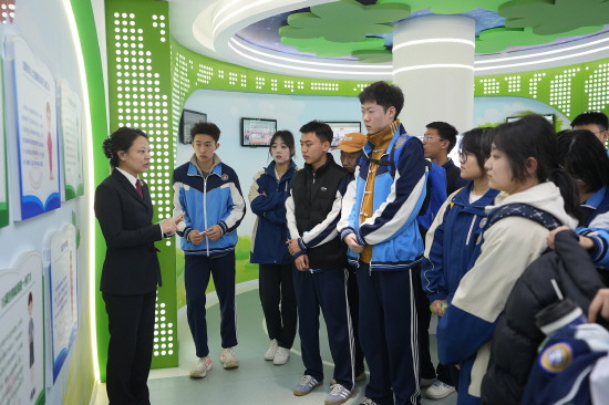 图① 近日,内蒙古自治区呼和浩特市土默特中学学生走进呼和浩特市赛罕区人民检察院未成年人法治教育实践基地,开启新学期法治第一课。图为检察人员在法治主题馆向学生介绍未成年人保护法相关内容。