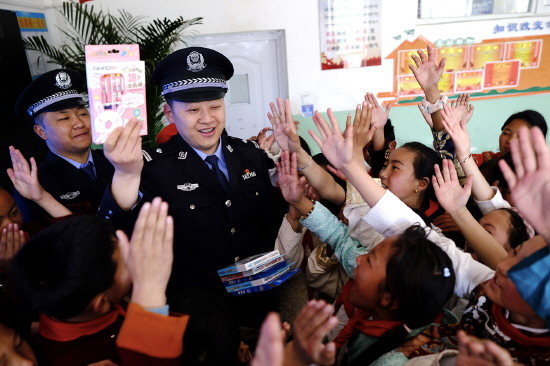图② 青藏铁路公安局哈尔盖站派出所、哈尔盖镇派出所民警近日走进刚察县哈尔盖镇民族小学,开展爱路护路安全宣传。图为民警与学生进行有奖互动问答。