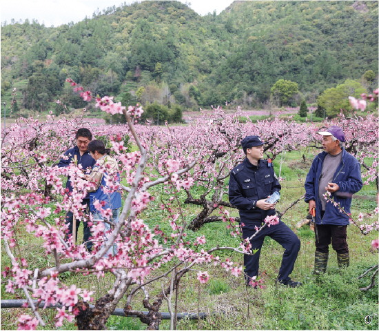 图① 4月1日,浙江省三门县公安局海润派出所组织民警与网格员深入田间地头走访,宣传涉农相关法律知识,护航春耕生产。
